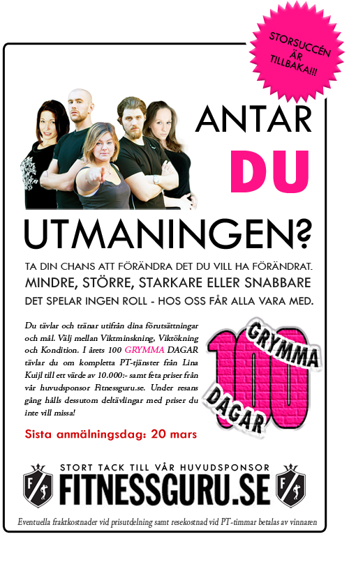 Gå in på http://hundragrymmadagar.shapemeup.se/anmalan/ och anmäl dig NU! Mer info om anmälan och tävlingen finns där!