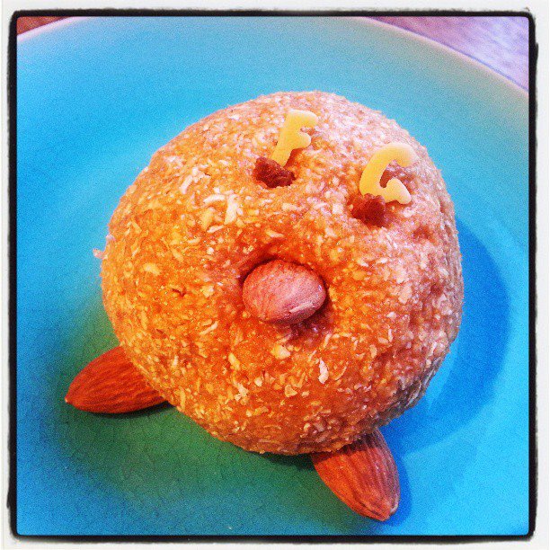 I denna skapelse på bilden så är det One Whey isolat med smak utav mango blandat med just mango och mortlade havregryn. Brukar att göra mindre bollar annars men nu så fick jag pippi på att göra en stor. ;)