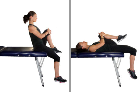 Eftersom RF är lite slackad i sittande läge(böjd höft), så kan det vara av intresse att hitta en specifik övning för denna. En benspark där du kan ligga ner, är ett bra alternativ. Du bör dock inte köra båda benen samtidigt eftersom du då får mycket stor lordos och riskerar en facettledsinklämning. Ta ett ben i taget och tag tag i det inaktiva benet med båda händerna. Tryck sedan det inaktiva benet(böjt) mot magen för att låsa fast ländryggen mot underlaget.