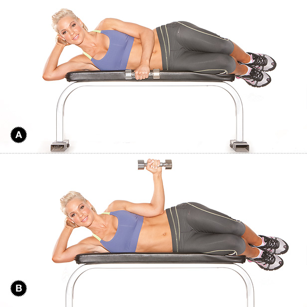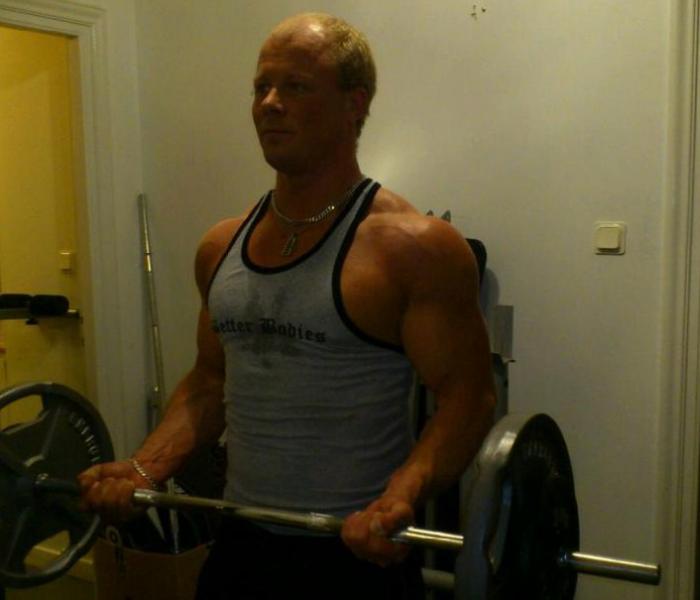 Sätt armbågen i axelhöjd, spänn magen (svanka inte!) och ta närmsta benet och kliv ett steg framåt. Sätter du armen lite högre så stretchar du lilla bröstmuskeln. Domningar och stickningar kan förekomma här, men det är inget farligt.