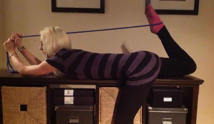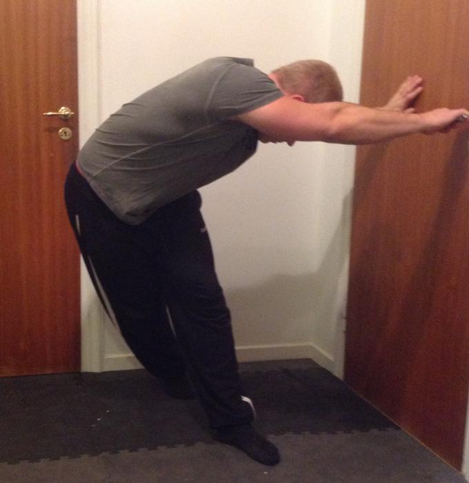 Ta tag i handtaget, luta dig tillbaka så att du "hänger" i handtaget. Ta ett kliv bakåt och åt sidan (högra foten på bilden) så att kroppens ena sida bildar en båge. Ta handen som inte håller i handtaget och sätt den mot väggen. Den handen använder du sedan för att pressa ifrån med och öka stretchen.