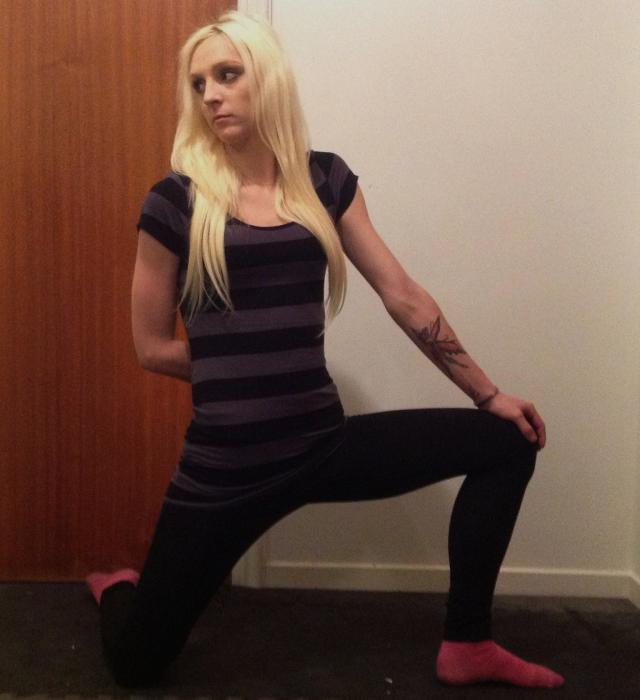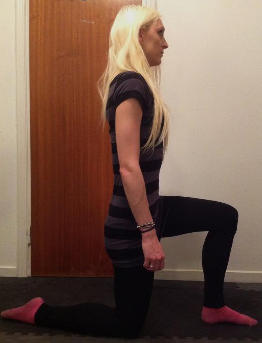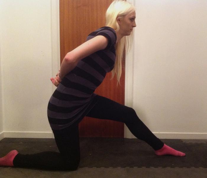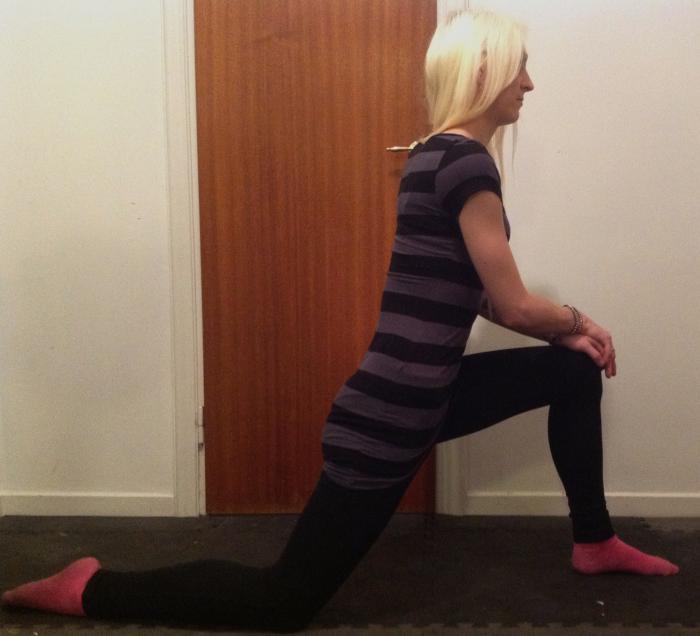 Här pressas höften framåt. Du får inte svanka! Drag i ljumskar kan förekomma här. Denna övning kan också användas för Rectus femoris om bakre fotenligger upphöjd eller dras i med ett hopprep över axlarna och fäst i foten. (se sästa övning så förstår ni)