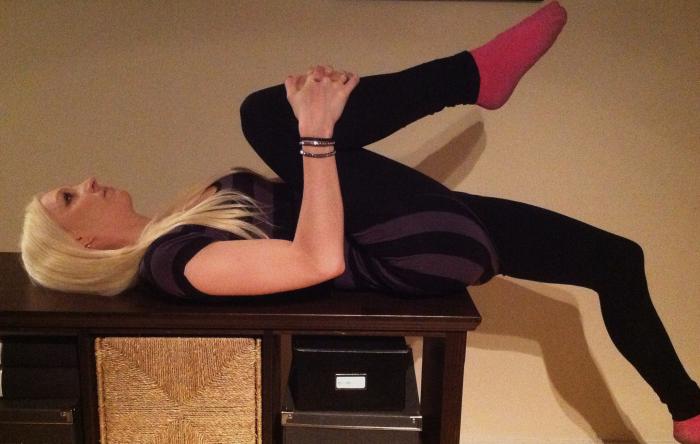 Pressa ena benet mot kroppen så att ländryggen ligger mot underlaget. Pressa sedan andra benet nedåt. Denna övning fungerar mycket bättre om någon hjälper till och pressar det bortre benet nedåt.