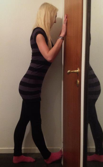 Viktigt här att fotbladet viks upp ordentligt mot fäggen innan du pressar fram kroppen mot väggen. Också viktigt att benet är RAKT! Annars stretchas fel muskel. Denna övning kan användas för att stretcha djupa vadmuskeln (draget ska då kännas i hälsenan) om knät är böjt.