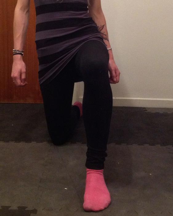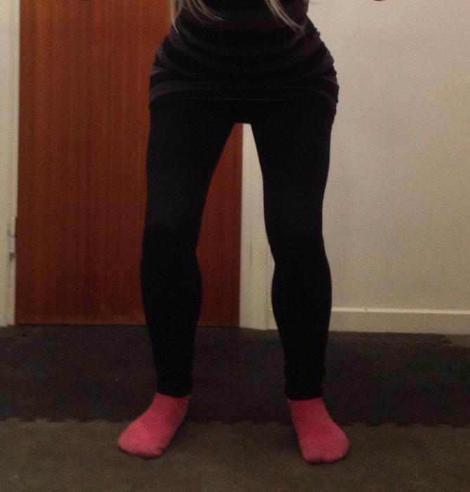 När det gäller teknikmomenten och knäkontrollen så ska ni träna på att inte vackla inåt i fotled eller knäled bland annat. (på bilden kan man ana en lätt plattfot p g a att folederna lätt tippar inåt. Ni ska också träna på att gå ner "centralt", så att tyngden fördelas lika över båda benen.