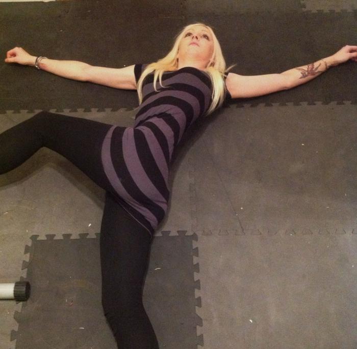 Ligg som ett "T", ta ena benet och för ut rakt åt sidan ( kan även föras upp mot handen om stretchen fortfarande känns i bålregionen och inte flyttas ned till sätet. Axlarna ska ha markkontakt genom hela stretchen.