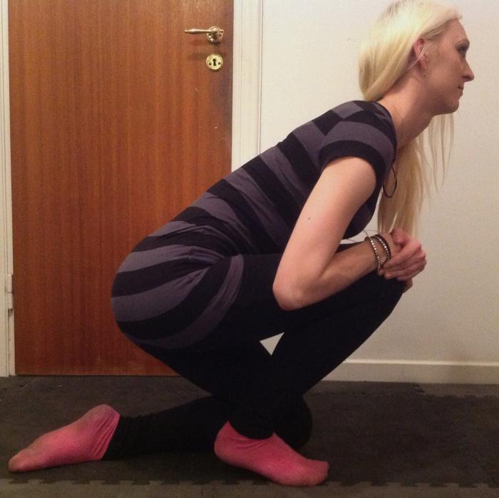 Foten som är i marken ska placeras framför höftleden och gärna gansla långt framåt om möjligt. Stretchen kommen av att du drar i hopprepen för att böja i knäleden.