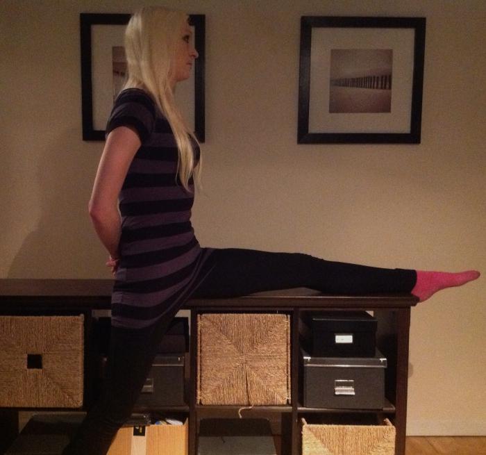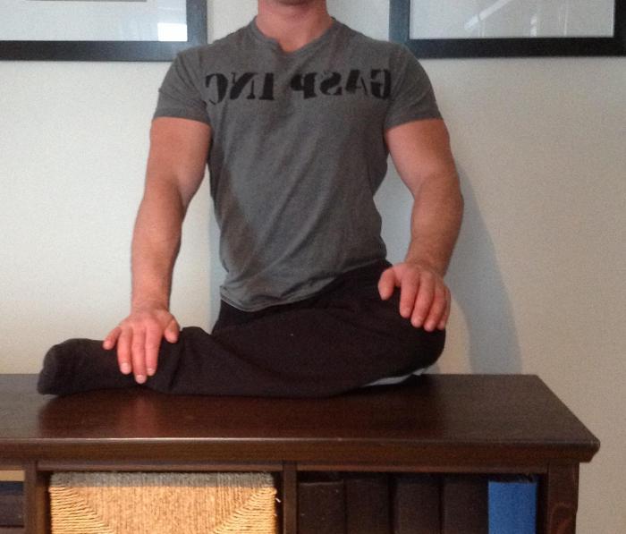 Lyft upp benet på en lämplig höjd. Knät ska ha samma höjd som höftleden och ligga rakt utanför i 90 graders vinkel. Även knäleden ska ha 90 graders vinklel. (ta en lägre höjd vid foten om du inte klarar att få upp foten till detta läge) Höften ska inte vara vriden, utan ska peka rakt framåt. Stretcha genom att med bibehållen lätt lordos böja dig framåt.