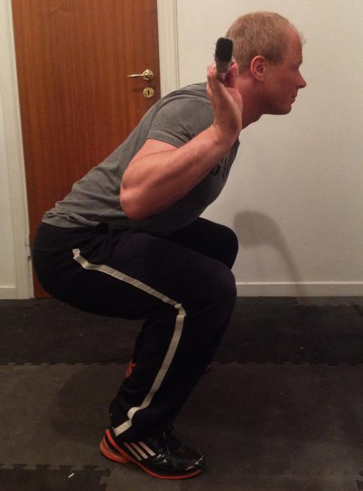 Från sidan så kontrollerar ni (någon får hjälpa er) att ni kan komma ned så djupt att låren är parellella med underlaget utan att normalkurvaturen i ryggen tappas och höften börjar tippa (Ett tränat öga kan se att jag börjat tappa lite på bilden). Ni bör även här kontrollera att knäna kan gå framför tån (Inte ett behov för alla dock). Blicken framåt inte uppåt!